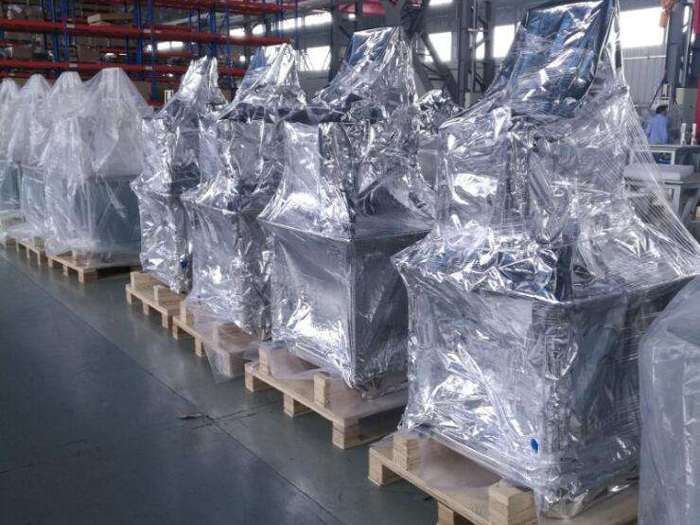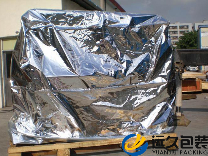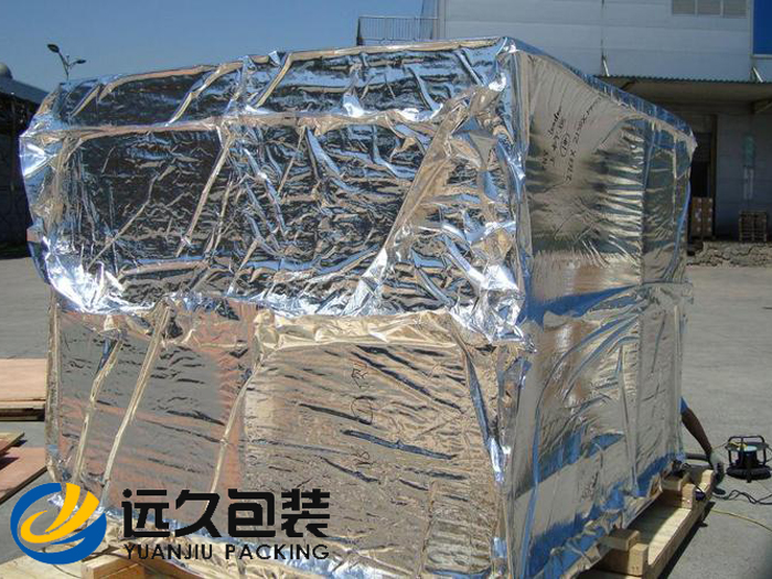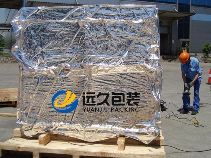 對于一些出口運輸的大型設備,由于體積大、自身重量重,使用包裝箱成本太高,長時間的海上運輸如果裸裝會被海水腐蝕生銹,最好最經濟的做法就是做一個重型木托盤,將設備安裝在木托盤上,然后做一個鋁箔真空包裝袋套在設備上抽真空。